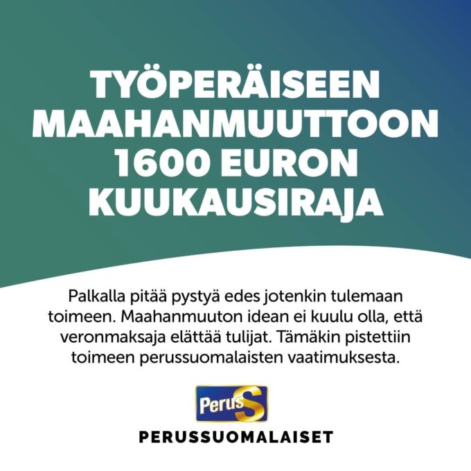 * Perussuomalaiset ovat vaatineet, että työntekoon oikeuttavan oleskeluluvan ehtona olisi noin 2 500 tai jopa 3 000 Euron kuukausipalkka. Tätä tarvitaan keinona rajata alhaisen palkkatason työperäistä maahanmuuttoa ja vähentää julkiselle taloudelle siitä johtuvia lisämenoja.