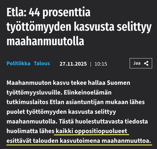 * Mitä tulisi tehdä? Ainakin kolme erillistä viimeaikaista tutkimusta ovat osoittaneet, että työttömyyden kasvusta jopa 44 % on selitettävissä työttömyysperustaisella maahanmuutolla. Siksi meidän täytyy välittömästi lopettaa työttömyysperäinen maahanmuutto, jota kaikki vasemmistopuolueet, Keskusta ja Kokoomus peräänkuuluttavat.