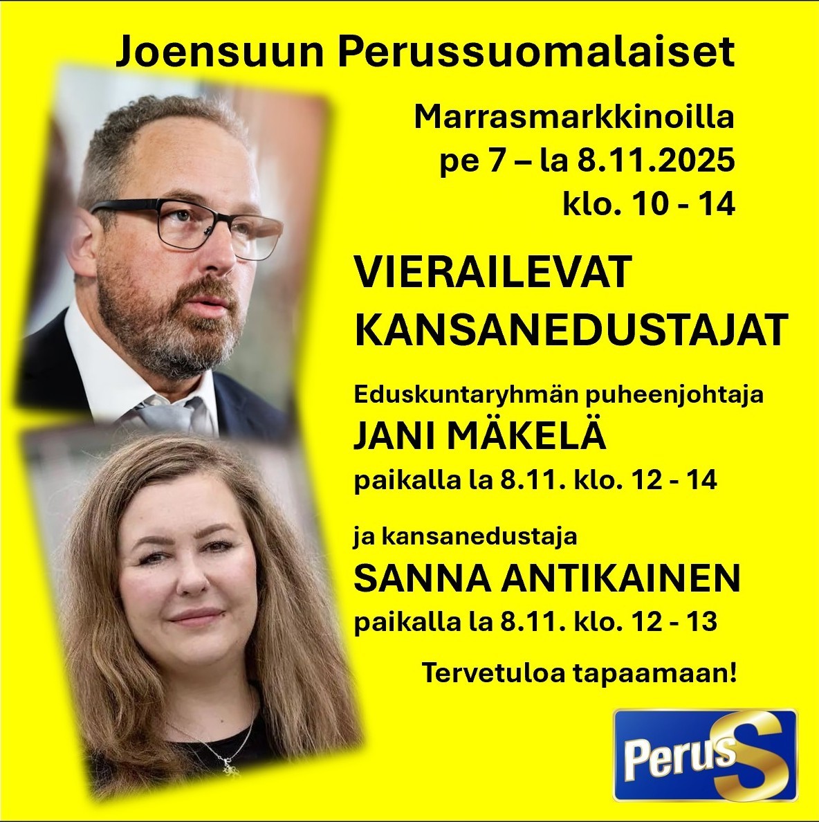 Eduskuntaryhmän puheenjohtaja, kansanedustaja Jani Mäkelä ja Outokumpulainen kansanedustaja Sanna Antikainen vierailevat Joensuun Perussuomalaisten toriteltalla Marrasmarkkinoiden aikaan lauantaina 8.11.2025 ja ovat paikalla seuraavasti: