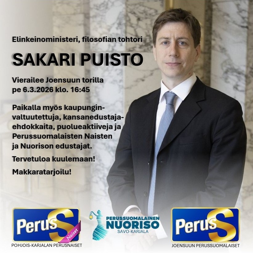Elinkeinoministeri, filosofian tohtori Sakari Puisto vierailee Joensuun Perussuomalaisten toriteltalla pe 6.3.2026 klo. 16:45 alkaen.