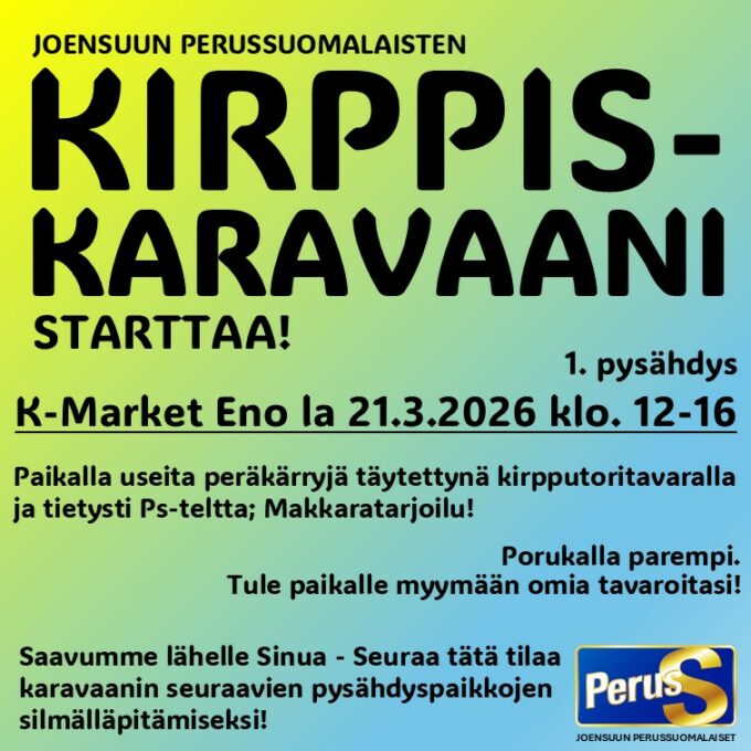 Kirppiskaravaanin myöhemmistä pysähdyspaikoista ilmoitetaan täällä virallisten nettisivujen Tapahtumat-osiossa ja Joensuun Perussuomalaisten Facebook-sivuilla https://www.facebook.com/profile.php?id=100064281626243